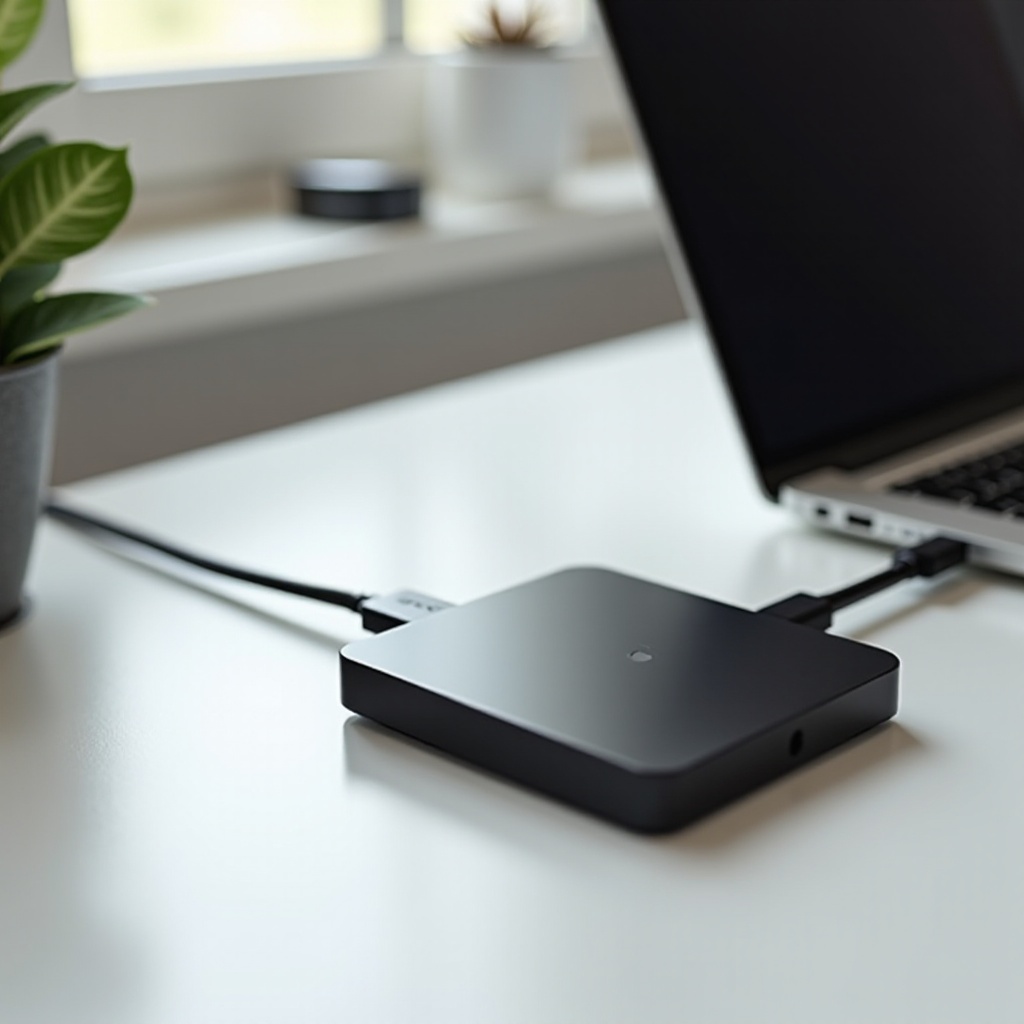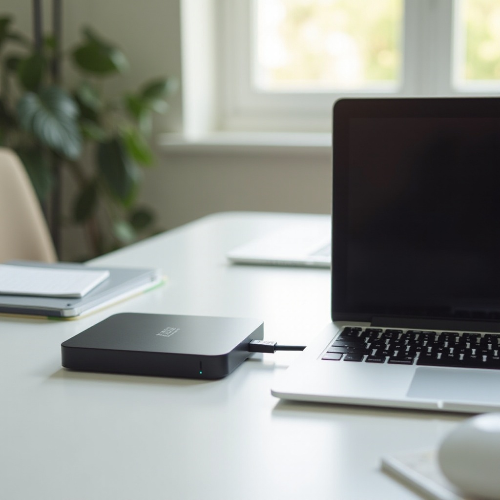 - التوصيل: قم بتوصيل القرص باستخدام كابل مناسب؛ تأكد من أنه يناسب المنفذ USB أو Thunderbolt بشكل مريح.